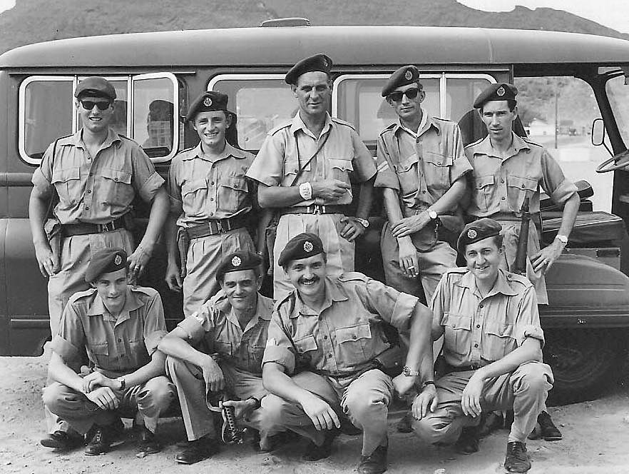 5 thoughts on “Aden photo section – L to R (back row) Baz Walker; Al Simms; WO Roy Elliott; Cpl Brian Goodwin; Cpl Dutch Holland L to R (front row) ? ; Cpl Don Jones; Cpl Dave Humphrey; Brian Mateer”