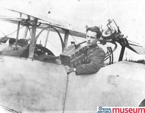 Lt Stuart Christian Tinne RFC 1895-1918 of Number 1 School of Aerial Gunnery, Hythe in Kent, demonstrates the use of a hand-held camera for photographic reconnaissance in the back seat of a Nieuport aircraft. Lieutenant-Colonel J.T.C. Moore-Brabazon designed the first effective aerial camera in 1915.